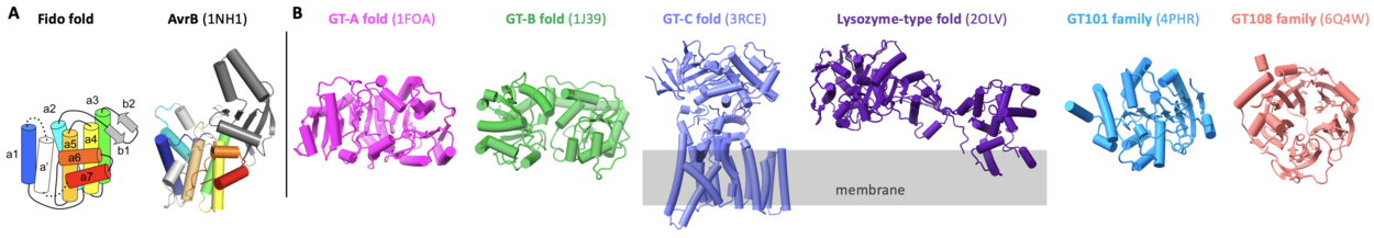 | + | [[File:GT138-Fig1-V3.png|thumb|1250px|center|'''Figure 1. Glycosyltransferase folds.''' ('''A''') Fido fold (left, image from <cite>Kinch2009</cite>) is found in diverse enzymes including AvrB (right), which is a distinct glycosyltransferase. ('''B''') Other known glycosyltransferases contain folds of GT-A, GT-B, GT-C, lysozyme-type, GT101, and GT108. PDB codes are provided for representative structures.]] | ||