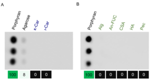 The first characterized member in the CBM99 family is FvCBM99 [1]. The CBM FvCBM99 bound to porphyran and displayed a weak affinity to agarose (Fig. 1). It was incapable of binding to the other examined polysaccharides, including κ-carrageenan, ι-carrageenan, alginate, sulfated fucan, chondroitin sulfate A sodium salt, hyaluronic acid, and pectin. Furthermore, FvCBM99 bound to porphyran tetrasaccharide with an affinity constant of 1.9 × 10-4 M, but not to agarose tetrasaccharide. Since agarose chains usually contain a few characteristic structural units of porphyran [2], it was thus speculated that the weak affinity of FvCBM99 to agarose was attributed to the structural heterogeneity of agarose. The polysaccharide and oligosaccharide binding assays show that FvCBM99 specifically binds to the major structural units of porphyran.