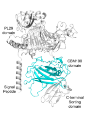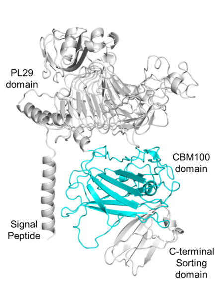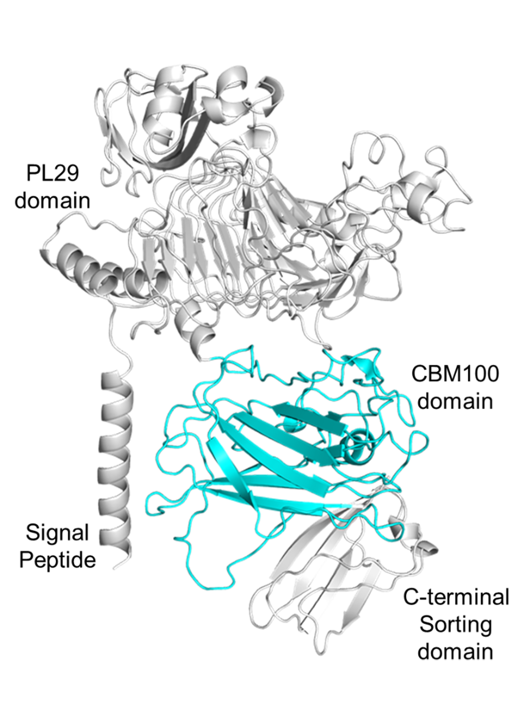 Domain analysis of the parent enzyme of PhCBM100. The enzyme consists of a signal peptide (1-23 amino acids), a PL29 domain (68-399 amino acids), a CBM100 domain (viz., PhCBM100; 555-785 amino acids) and a C-terminal sorting domain (786-851 amino acids).