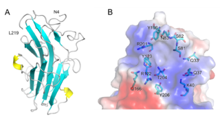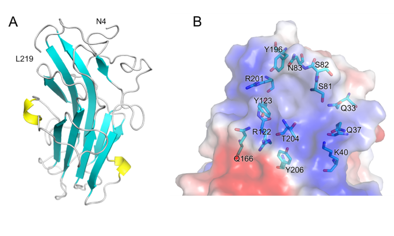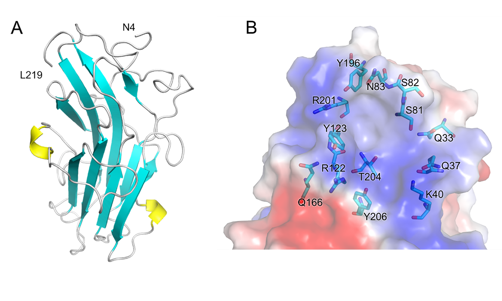 Structure of PhCBM100. (A) Schematic representation of PhCBM100 showing helices in yellow and strands in cyan. (B) Detailed view of the putative PhCBM100 binding site. The surface is colored by electrostatic potential, from blue (positive charge) to red (negative charge).