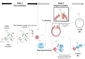 Structural analysis (see #Three-dimensional Structure below) and mutational analysis suggest that E1442 of TiCGSCy acts on an anomeric carbon of a glucose moiety at subsite −1 as a nucleophile and E1356 of TiCGSCy acts on a scissile bond of a substrate via 3-hydroxy group of a glucose moiety at subsite +2 as an acid/base [1]. The reaction mechanism of TiCGSCy is noncanonical in that a substrate hydroxy group participates in the catalytic process (Fig.1)[1].