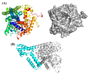 The apo-structure of the recombinant TiCGSCy was determined at 3.8 Å by X-ray crystal structure analysis (PDB: 8WY1) [1]. The overall structure comprises a single (α/α)6-barrel domain with several inserted α-helices and TiCGSCy has a large active-site pocket (Fig.3) [1].