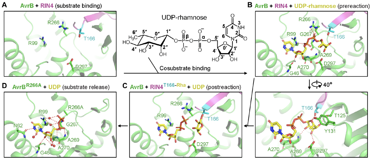 Figure 2. Catalysis mechanisms for RIN4 rhamnosylation by AvrB. (A) Fido fold (left [4]) is found in diverse enzymes including AvrB (right), which is a distinct glycosyltransferase. (B) Other known glycosyltransferases contain folds of GT-A, GT-B, GT-C, lysozyme-type, GT101, and GT108. PDB codes are provided for representative structures.