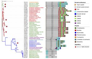 Figure 2. Phylogenetic tree representing 52 GH119 representative sequences [7]. Tree branches in the same clade share the same colour. Stars mark experimentally characterised sequences. The remaining annotations to each branch, from left to right, include: NCBI accession number, source organism name coloured by phylum and predicted sequence domain composition.
