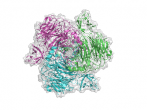 The structure for the K1F tailspike enzyme has been solved by Stummeyer et al. [4]. The protein structure is similar to other phage tailspike endo-hydrolases in that it is an extended, trimeric molecule. The first tailspike enzyme to be studied in detail was the endo-rhamnosidase from the Salmonella phage P22 [6], which is in family GH90. The pictures here were generated in Pymol from PDB entry 1voe. Each monomer is a different colour to highlight the trimeric nature of the protein.