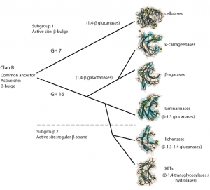 Family 16 is a member of clan GH-B together with family 7 with whom they share their β-jellyroll fold. The different specificities of family 16 has been proposed to have evoloved from an ancestral β-1,3-glucanase [8]. The first branching in family 16 lead to the evolution of the κ-carrageenases and the β-agarases and a later branching event lead to the arisal of the lichenases and the XETs [9] (see figure).