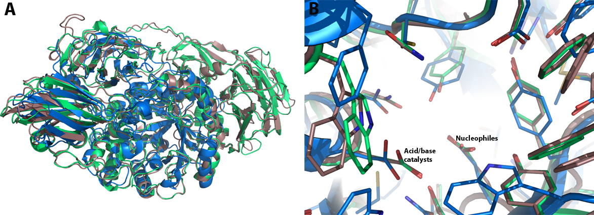 GH35 enzymes belong to Clan GH-A, and thus have a (α/β)<sub>8</sub> TIM barrel comprising the catalytic domain. A structural analysis of the galactose-binding active-site was based on the comparison of the crystallographic models of the native Psp-β-gal and Tr-β-gal enzymes and their respective complexes with galactose. A single galactose molecule is bound to the TIM barrel domain of the enzyme in the chair conformation in the β-anomeric configuration. Two glutamic acid residues act as the general acid-base and nucleophilic catalysts; these are presented on strands 4 and 7 of the barrel.Although the crystal structures of Psp-β-gal and Tr-β-gal are similar, interpretation of the structure of Tr-β-gal is somewhat different from that presented earlier for Psp-β-gal: Rojas et al. considered Psp-β-gal to be composed of five distinct structural domains. The overall structure is built around the first, TIM barrel, domain. Domain 2 us an all β-sheet domain containing an immunoglobulin-like subdomain, domain 3 is based on a Greek-key β-sandwich and domains 4 and 5 are jelly rolls <cite>Rojas2004</cite>. In contrast, Maksimainen et al. concluded that the Tr-β-gal and Psp-β-gal structures both form six similar domains and <cite>Maksimainen2010</cite>. The most of the structural differences between them are in the conformations of the loop regions. | GH35 enzymes belong to Clan GH-A, and thus have a (α/β)<sub>8</sub> TIM barrel comprising the catalytic domain. A structural analysis of the galactose-binding active-site was based on the comparison of the crystallographic models of the native Psp-β-gal and Tr-β-gal enzymes and their respective complexes with galactose. A single galactose molecule is bound to the TIM barrel domain of the enzyme in the chair conformation in the β-anomeric configuration. Two glutamic acid residues act as the general acid-base and nucleophilic catalysts; these are presented on strands 4 and 7 of the barrel.Although the crystal structures of Psp-β-gal and Tr-β-gal are similar, interpretation of the structure of Tr-β-gal is somewhat different from that presented earlier for Psp-β-gal: Rojas et al. considered Psp-β-gal to be composed of five distinct structural domains. The overall structure is built around the first, TIM barrel, domain. Domain 2 us an all β-sheet domain containing an immunoglobulin-like subdomain, domain 3 is based on a Greek-key β-sandwich and domains 4 and 5 are jelly rolls <cite>Rojas2004</cite>. In contrast, Maksimainen et al. concluded that the Tr-β-gal and Psp-β-gal structures both form six similar domains and <cite>Maksimainen2010</cite>. The most of the structural differences between them are in the conformations of the loop regions. | ||