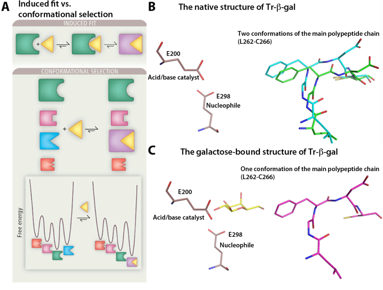 | − | Additionally, Maksimainen et al. have described conformational changes in two loop regions of the active site of Tr-β-gal, thus implicating a conformational selection mechanism for the enzyme | + | Additionally, Maksimainen et al. have described conformational changes in two loop regions of the active site of Tr-β-gal, thus implicating a conformational selection mechanism for the enzyme. Unlike, the induced fit theory which assumes that the initial interaction between a protein and its binding partner induces a conformational change in the protein through a stepwise process, the conformational selection theory is based on an assumption that the unbound protein exists as an ensemble of conformations in dynamic equilibrium. Interaction between a weakly populated, higher-energy conformation and a binding partner causes the equilibrium to move in favor of the selected conformation <cite>Tsai1999</cite>. This can be seen in the structures of Tr-β-gal: the open and closed conformation are both favorable in the native structure and the closed conformation becomes more favorable in the complex structures (Figure 2) <cite>Maksimainen2010</cite>. The acid/base catalyst Glu200 exhibited two different conformations which affect the p''K''<sub>a</sub> value of this residue and thus the catalytic mechanism. |