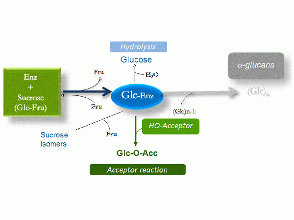 Sucrose analogues such as α-D-glucopyranosyl fluoride, ''p''-nitrophenyl α-D-glucopyranoside, α-D-glucopyranosyl α-L-sorofuranoside and lactulosucrose were also reported as D-glucopyranosyl donors <cite>Genghof1972,Figures1976,Binder1983</cite>. GH70 glucansucrases also transfer the D-glucosyl units from sucrose onto hydroxyl acceptor groups. A large variety of acceptors may be recognized by glucansucrases including carbohydrates, alcohols, polyols or flavonoids to yield oligosaccharides or gluco-conjugates <cite>Monchois1999,Leemhuis2012,Andre2010,Koepsell1953,Nakahara1995,Richard2003,Bertrand2006</cite>. The structure of the resultant glucosylated product is dependent upon the enzyme specificity. | Sucrose analogues such as α-D-glucopyranosyl fluoride, ''p''-nitrophenyl α-D-glucopyranoside, α-D-glucopyranosyl α-L-sorofuranoside and lactulosucrose were also reported as D-glucopyranosyl donors <cite>Genghof1972,Figures1976,Binder1983</cite>. GH70 glucansucrases also transfer the D-glucosyl units from sucrose onto hydroxyl acceptor groups. A large variety of acceptors may be recognized by glucansucrases including carbohydrates, alcohols, polyols or flavonoids to yield oligosaccharides or gluco-conjugates <cite>Monchois1999,Leemhuis2012,Andre2010,Koepsell1953,Nakahara1995,Richard2003,Bertrand2006</cite>. The structure of the resultant glucosylated product is dependent upon the enzyme specificity. | ||