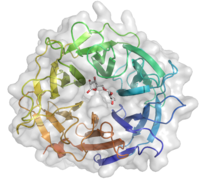 | − | [[Image: | + | [[Image:overallsurf.png|thumb|200px|right|'''Figure 3. '''Cartoon representation of the overall structure of Arb93A''' (PDB ID [{{PDBlink}}2w5o 2W5O] <cite>Carapito2009</cite>. Propeller colored by from N to C-terminus (blue to red) and arabinobiose depicted as balls and sticks.]] |
