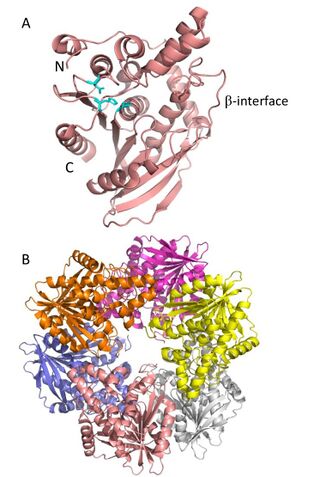 - The first resolved structure in this family was the cephalosporin C deacetylase, CAH (PDB ID 1ODS) from B. subtilis strain 168 in 2003[5]. The quaternary structure consisted of a trimer of dimers to make up a donut-shaped homohexamer with 32kDa subunits that each adopt the α/β hydrolase fold (See Fig. 1A)[5]. The hydrophobic core containing the six active site centers is thought to help exclude large substrates and is shielded from solvents through a lid-like domain[5]. In order for the hexamer to form, there are α-helix interactions as well as a β-strand-like interface associating between monomers (See Fig. 1A)[5, 9].