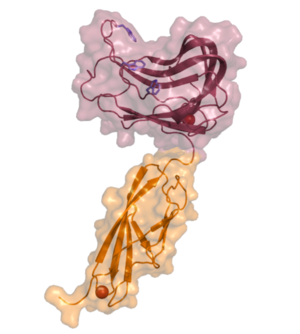 [[File:pkd-cbm44.png|thumb|300px|right|'''Figure 1.'''  Three-dimensional structure of PKD-CBM44 as two domains of the  multimodular cellulase ''Ct''Cel9D-Cel44A from ''Acetivibrio thermocellus'' ([https://www.rcsb.org/structure/2c26 PDB 2C26]) <cite>Najmudin2006</cite>. The PKD domain is shown in orange, CBM44 in purple. The tryptophans involved in ligand recognition are highlighted. The calcium atoms of both modules are shown as red spheres.]]