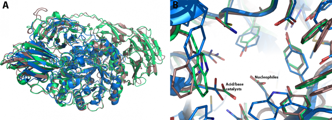 | − | [[Image: GH35 comparison.png|thumb|left| | + | [[Image: GH35 comparison.png|thumb|left|1100px|'''Figure 1.A)''' Comparison of the native structures of the GH35 β-galactosidases. Psp-β-gal (PDB code [http://www.rcsb.org/pdb/explore/explore.do?structureId=1TG7 1tg7]), Tr-β-gal (PDB code [http://www.rcsb.org/pdb/search/structidSearch.do?structureId=3OG2 3og2]) and Btm-β-gal (PDB code [http://www.rcsb.org/pdb/explore/explore.do?structureId=3D3A 3d3a]) are colored in green, brown and blue, respectively. '''B)''' Comparison of the active sites of the GH35 β-galactosidases. Psp-β-gal, Tr-β-gal and Btm-β-gal are colored as above-mentioned.]] |