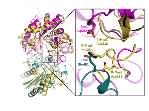 [[Image:GH3_2013_Fig4.png|thumb|right|500px|'''Figure 4.'''  '''Overlay of  barley β-glucan exohydrolase isoenzyme ExoI (domain 1 in magenta, and domain 2 in cyan) with the two-domain GH3 NagZ from ''B. subtilis''  (BsNagZ) (yellow) (PDB: 3BMX).  '''GH3 NagZ enzymes contain a conserved histidine/aspartate dyad within a flexible loop of the catalytic domain that has been proposed as the general acid/base.  In contrast to Exo1, the additional domain of BsNagZ does not participate in catalysis.  The catalytic Asp nucleophile however, is conserved across the GH3 family, including the NagZ enzymes.]]