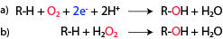 The catalytic mechanism of LPMOs is a matter of intense research and debate. Using labeled water and molecular oxygen, Vaaje-Kolstad et al [3] showed that one LPMO reaction requires two externally delivered electrons and molecular oxygen (Figure 2 - showing the old and the new equation). Phillips et al [26] pointed out that hydrogen abstraction (from the C1 or the C4) by a reactive oxygen species coordinated by the copper would be followed by hydroxylation and that this would lead spontaneous cleavage of the glycosidic bond, leaving either the C1 or the C4 oxidized (yielding a lactone in equilibrium with carboxylic acid or a 4-keto group in equilibrium with a gemdiol, respectively [27]). The nature of the hydrogen abstracting oxygen species is not known. Current literature seems to be converging towards a Cu(II)-oxyl species [26, 28, 29, 30, 31], but there are plausible alternatives that cannot be excluded, as outlined in e.g. [29, 31, 32, 33].