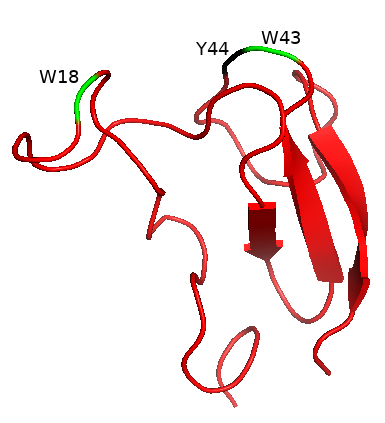 CBM5 of an endoglucanase from Erwinia chrysanthemi showing surface exposed aromatic residues; Trp18, Trp43 and Tyr44.