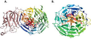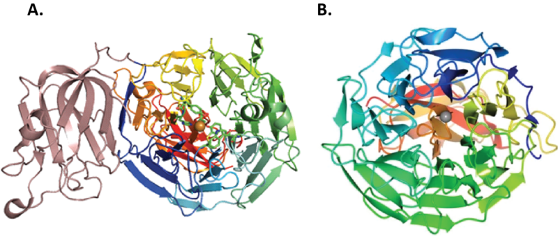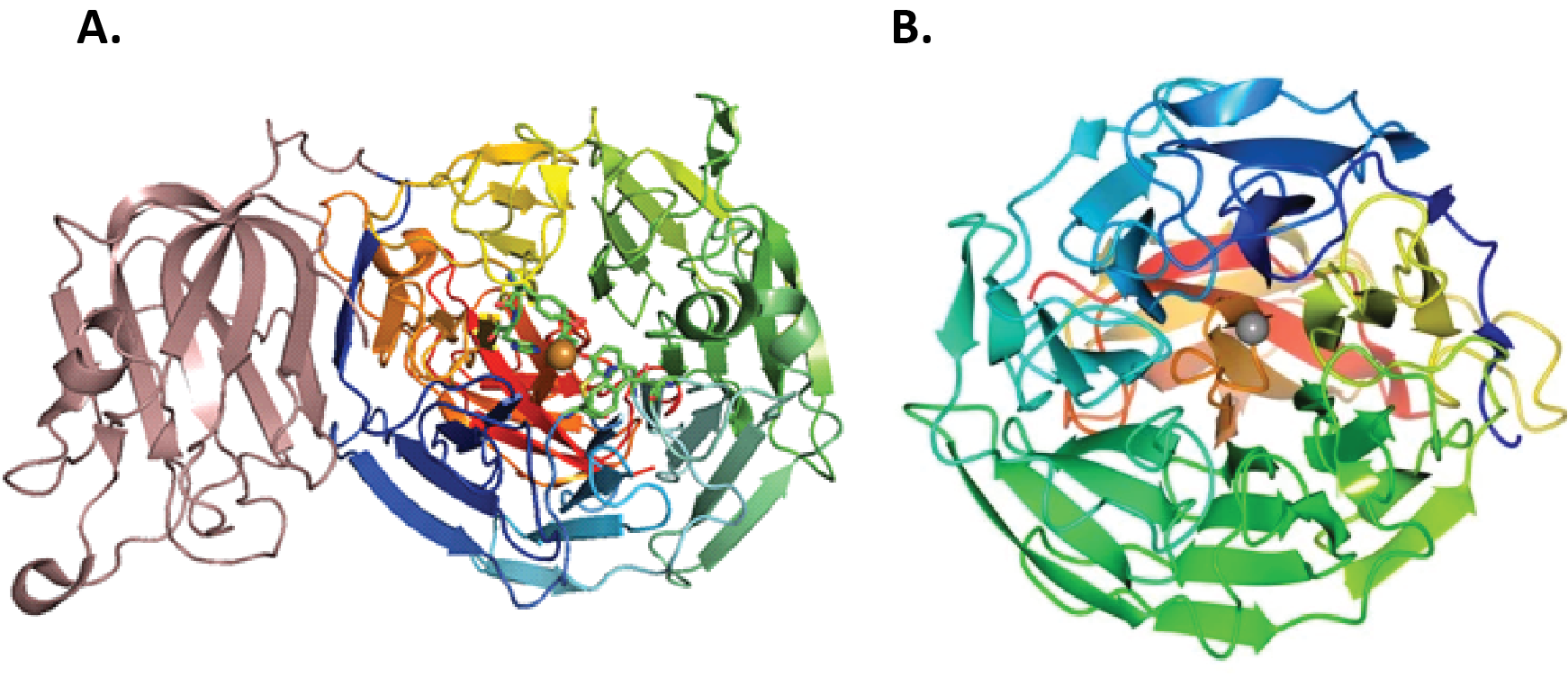 Figure#. Crystal structure of copper radical oxidases. A. FgrGalOx (PDB ID 1GOF), Copper ion in orange and B. CgrAlcOx (PDB ID 5C86), Copper ion in grey . This figure is adapted from [[1]].