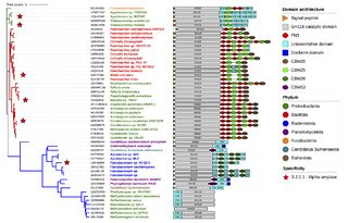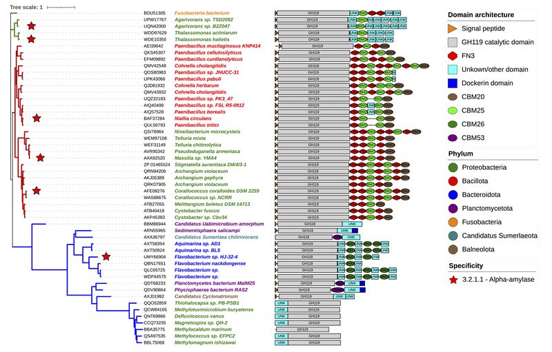 Phylogenetic tree of selected sequences representing the diversity of GH119, annotated with taxonomy and modularity