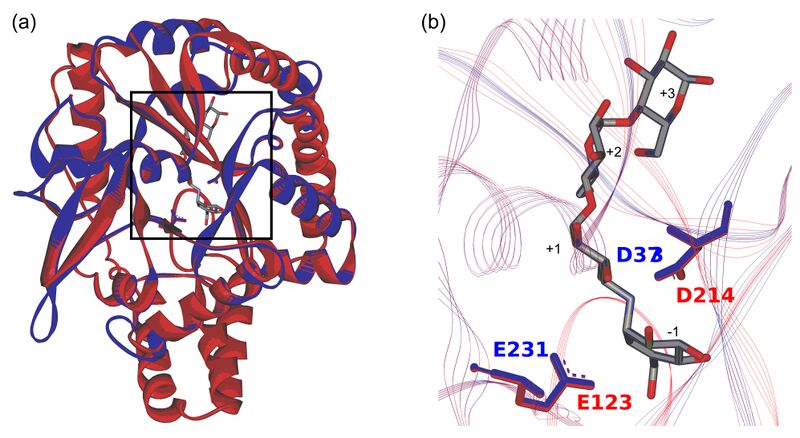Structure comparison of families GH57 and GH119. (a) Superimposed Thermococcus litoralis GH57 4-a-glucanotransferase catalytic (b/a)7-barrel with succeeding ahelical segments (red; real structure; PDB code: 1K1Y [18]; residues M1-Q381) with Bacillus circulans GH119 a-amylase substantial part of the (b/a)7-barrel domain (blue; modelled structure; residues T121-D429). The superimposed part covers 228 Ca-atoms with a 0.66 Å root-mean square deviation. The rectangle indicates a detailed view on the right. (b) A close-up focused on the catalytic residues in the structure of GH57 4-a-glucanotransferase (Glu123 and Asp214) and the proposed equivalent residues in the GH119 a-amylase (Glu231 and Asp373). Acarbose occupying subsites 1 through + 3 [40] in complex with GH57 4-a-glucanotransferase is shown. Source: Janeček et al. 2012, PubMed ID:22819817.