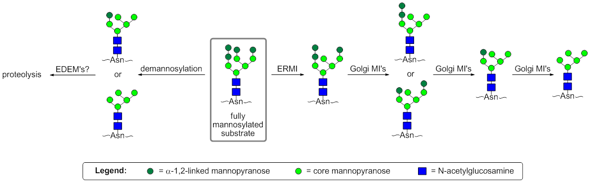 The third GH47 subfamily is composed of the ER degradation-enhancing mannosidase-like (EDEM) proteins. This subfamily is composed of 3 members in humans and was initially not thought to have direct glycosidase activity. However, it now appears that the EDEM1 and EDEM3 isoforms have glycosidase activity in vivo [5, 6]. All of these isoforms have been shown to accelerate the disposal of terminally misfolded proteins through ER-associated degradation (ERAD) [6, 7, 8]. The process of recognition of terminally misfolded proteins and the role of EDEM proteins is not fully understood, however, it is believed that EDEM proteins function as lectins, binding after demannosylation of the glycan. A current model for entry of glycoproteins into ERAD states that correct folding mediated by the calnexin folding cycle must occur before the slow demannosylation of the substrate affords Man6GlcNAc2, which is no longer a substrate for reglucosylation by UGGT1 and re-entry into the calnexin folding cycle [9]. It is not clear which mannosidases perform this extensive demannosylation in vivo. Upon extensive demannosylation to Man5-6GlcNAc2 structures it is proposed that EDEM proteins facilitate retro-translocation of the glycoprotein to the cytosol and its subsequent proteolysis, although the exact role of EDEM proteins has yet to be elucidated.