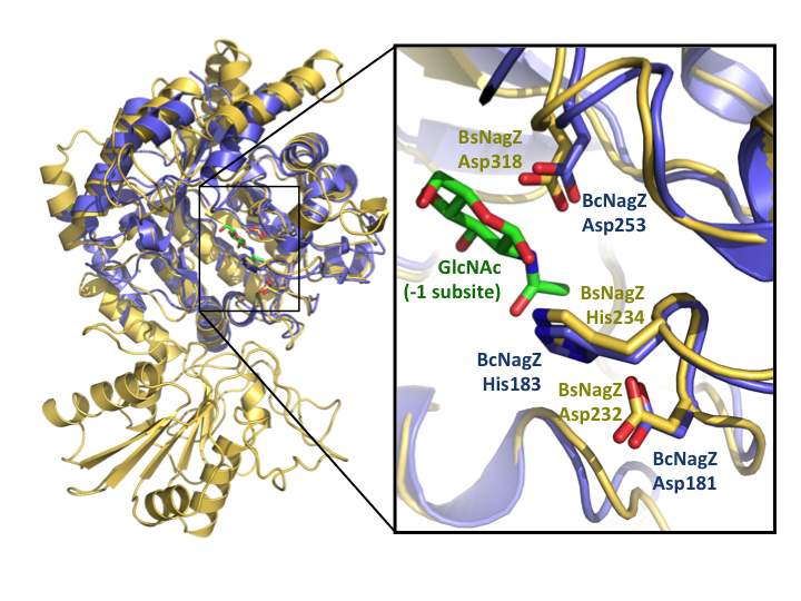 Figure 5. Overlay of Bacillus subtilis NagZ (BsNagZ) (yellow) (PDB: 3BMX) with a single-domain NagZ from the Gram-negative microbe Burkholderia cenocepacia (BcNagZ) (blue) bound to GlcNAc (green) (PDB: 4GNV). The majority of NagZ enzymes encoded by Gram-negative bacteria are single domain enzymes that use a putative histidine/aspartate dyad as the catalytic acid/base, as first described for BsNagZ [1] .